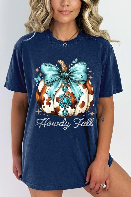 Howdy Fall Western Pumpkin Graphic Garment Dyed Tee. Unisex Crew Neck Short Sleeve Heavyweight Tees. Crafted from premium materials, tailored to your lifestyle, and offer a comfortable fit for any occasion. Family Group Uniforms Birthday Party Gift Concert Festival Events. High Quality Direct To Film Printed Graphic Design.