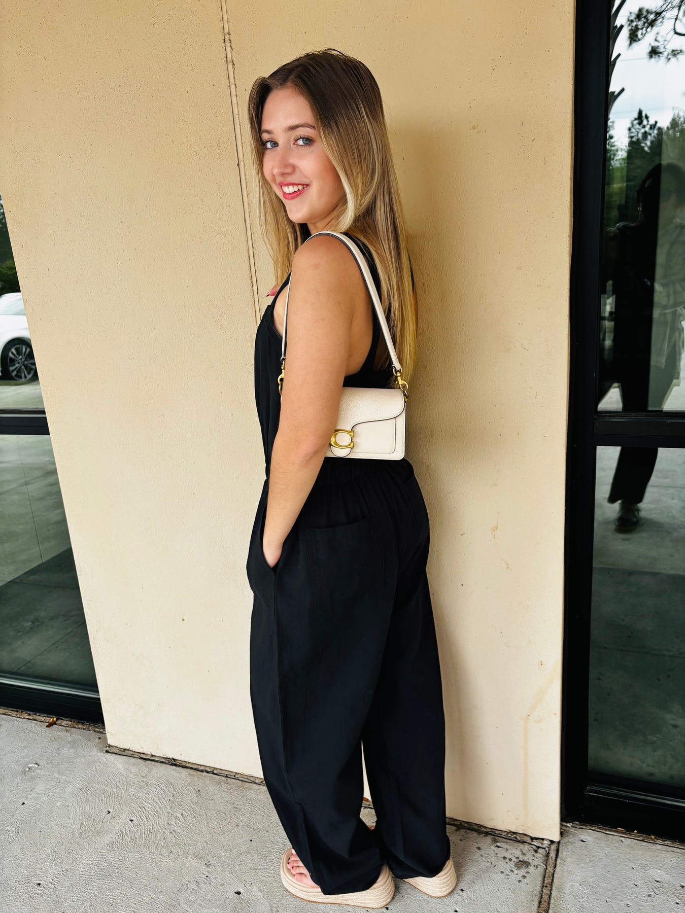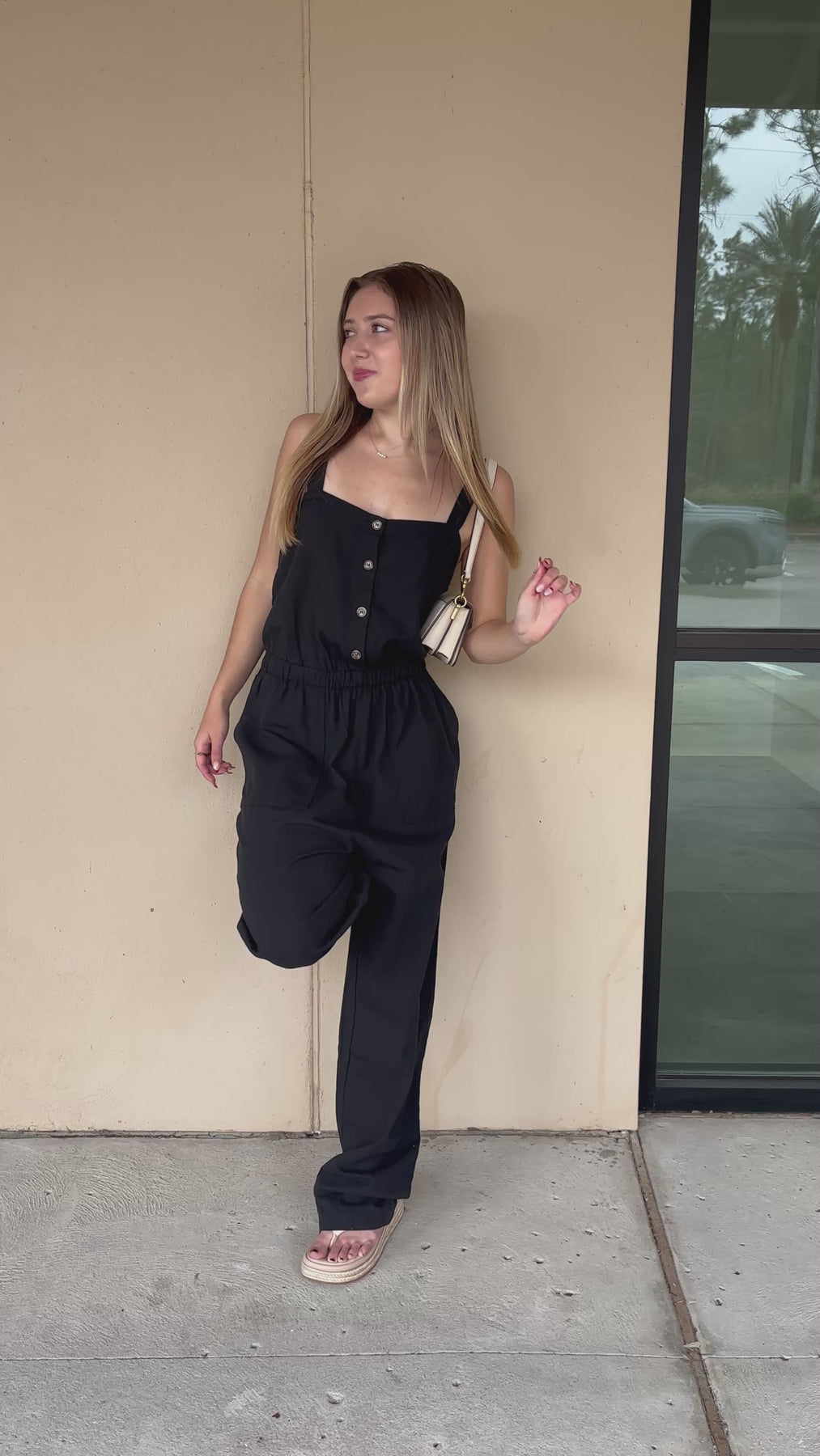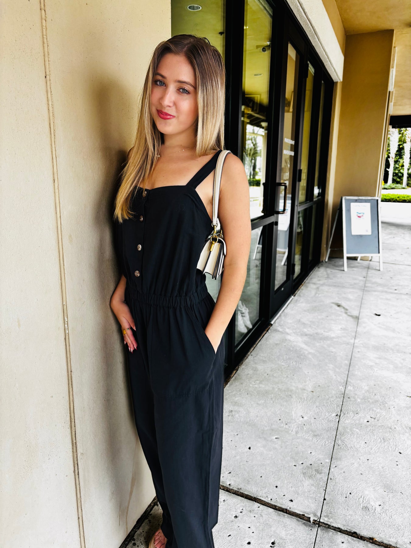 Cute sleeveless jumpsuit with a cinched waistline, front button down closure, and pockets