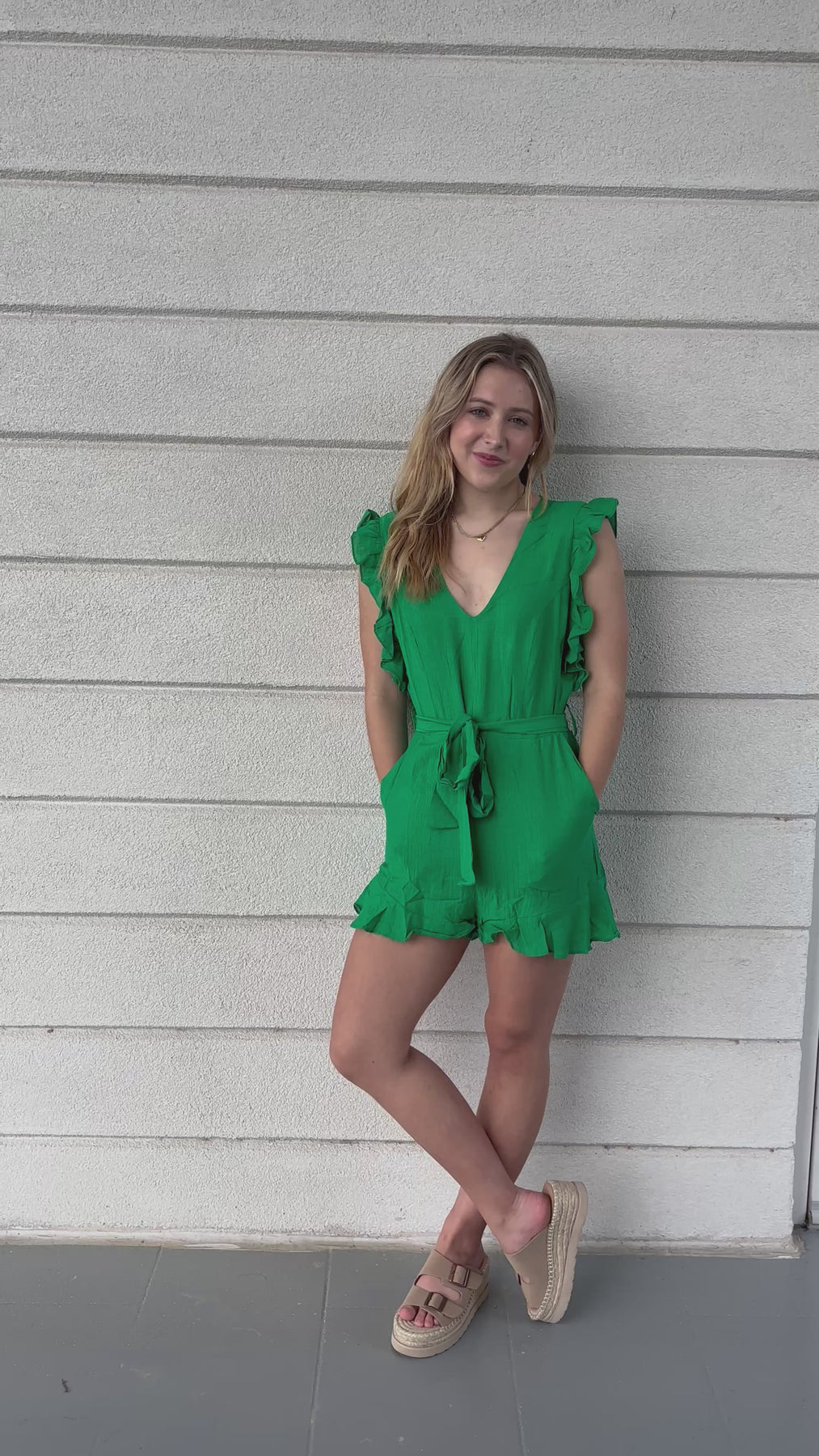 V neck romper featuring a waist tie and ruffle trim throughout. Look classy and elegant in this one of a kind romper